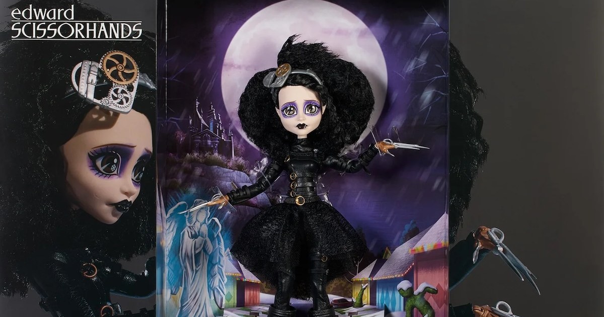 Standing at 10.5 inches, the new doll immediately captures attention. It features a genderbent version of the beloved film protagonist, complete with scissorhands and a distinctive hairstyle that fans will recognize. The character is dressed in a black faux leather bodysuit, and the design includes subtle nods to Tim Burton’s work through elements in the boots’ heels.