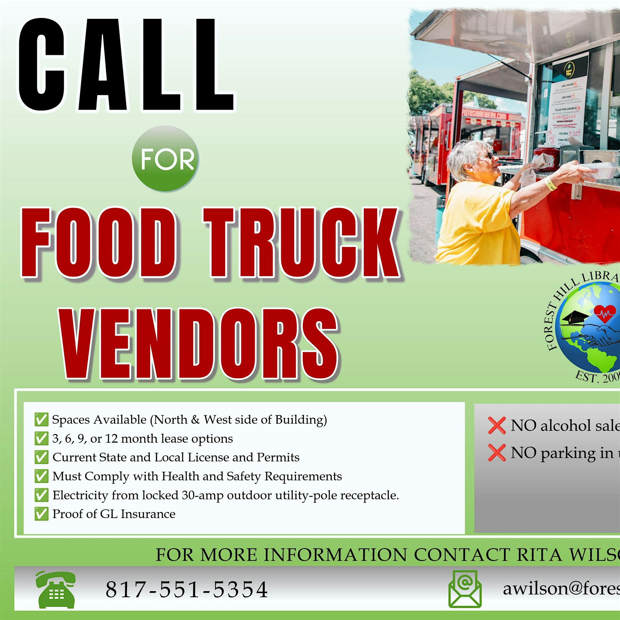 Call Rita Wilson at 817-551-5354 or email [email protected] to express interest. Don’t miss this chance to be part of a vibrant food scene right in the heart of the community!